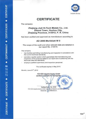 TüV AD-W02材料證(zhèng)書