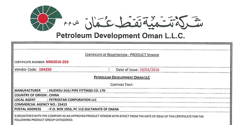 熱烈祝賀久立管件(jiàn)通過阿曼石(shí)油開發公司(sī)(PDO)批準供應商(shāng)認證(zhèng)